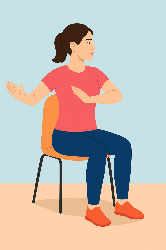 Halte den Rücken gerade und die Füße fest auf dem Boden. Hebe die Arme auf Brusthöhe, die Ellbogen leicht gebeugt, und drehe den Oberkörper langsam von links nach rechts – wie bei einer sanften Tanzbewegung.