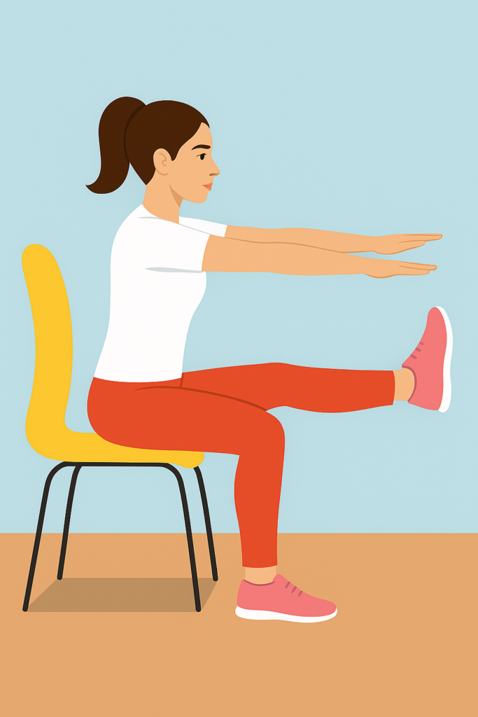 Setze dich gerade auf deinen Stuhl und stütze die Hände an den Stuhlkanten ab. Hebe das rechte Knie so hoch wie möglich, während du den Bauch anspannst und den Rücken gerade hältst. Halte die Position zwei Sekunden und wechsle dann das Bein.